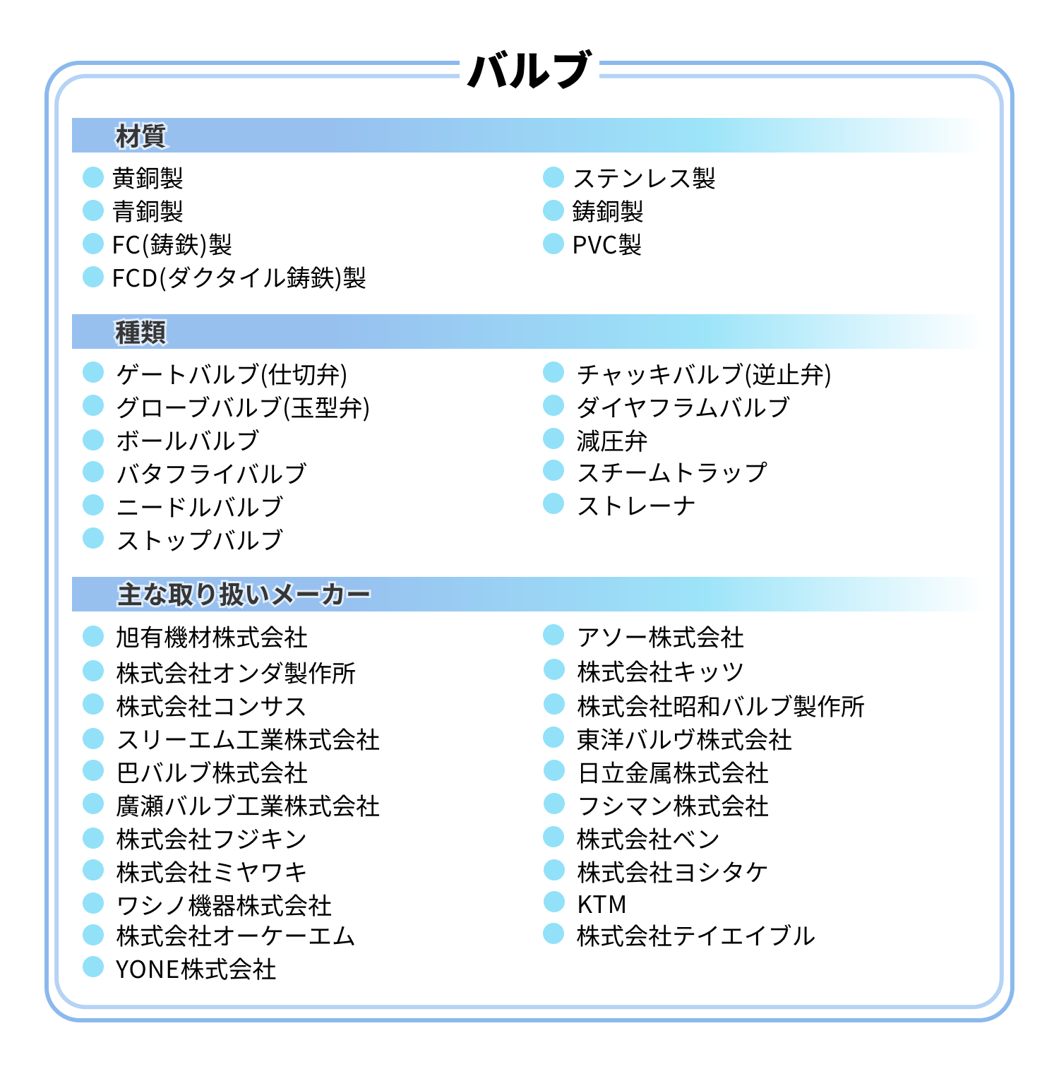 (フランジ形、 ねじ込み形) ゲートバルブ (仕切弁)、 グローブバルブ(玉形弁)、 ボールバルブ、 バタフライバルブ、 ニードルバルブ、ストップバルブ、 チャッキバルブ(逆止弁)