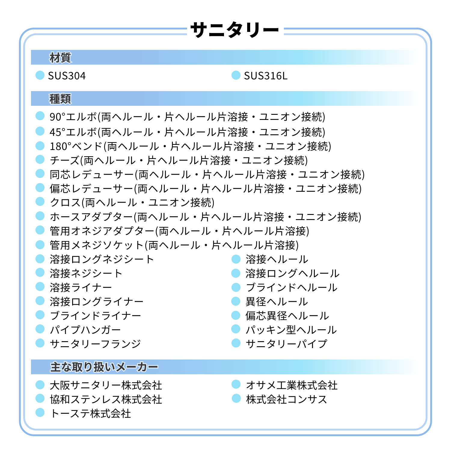 ヘルール継手、 サニタリー用バルブ、 サニタリー用パイプ、タンク、ポンプ、 ヘッダー配管他加工品